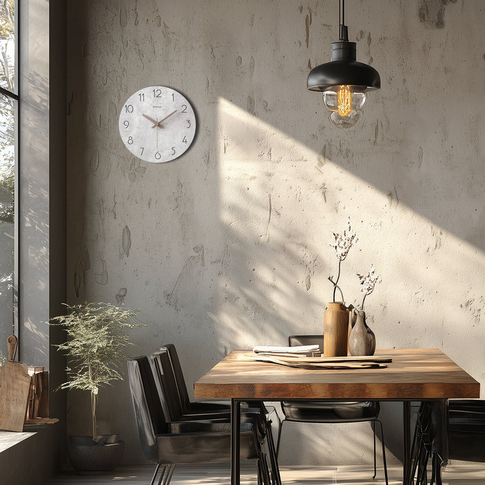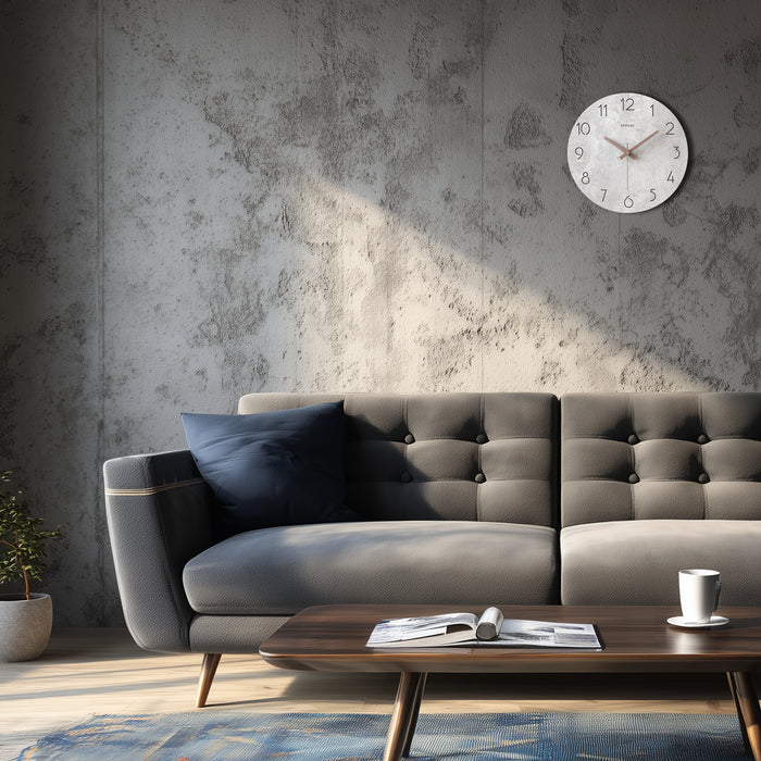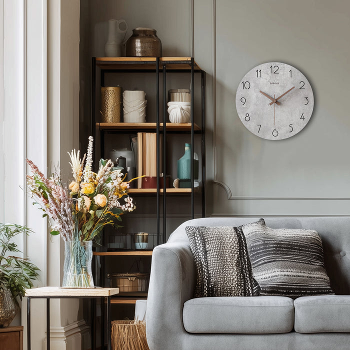 個性的なコンクリートの質感と暖かみのある木目調の長短針がアクセントの掛け時計です。モダンでクールな印象の空間を演出し、時計自体がオブジェとして壁にアクセントを持たせ、壁を彩るインテリアとしてもお楽しみいただけます。