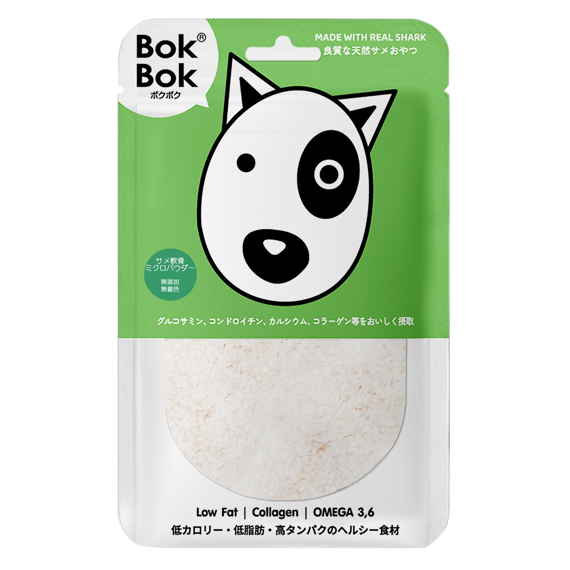 BokBok(ボクボク)は、 サメを主原材料に使用したタイランド産の犬用サメおやつです。サメ肉は低カロリー、低脂質、高タンパク質で、サメ軟骨は健康をサポートする成分がたっぷり含まれており、人間用サプリメントが注目されているのと同様、幼犬から老犬、幼猫から老猫まで幅広い世代に適した食材です。