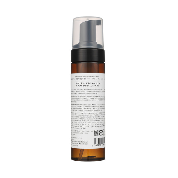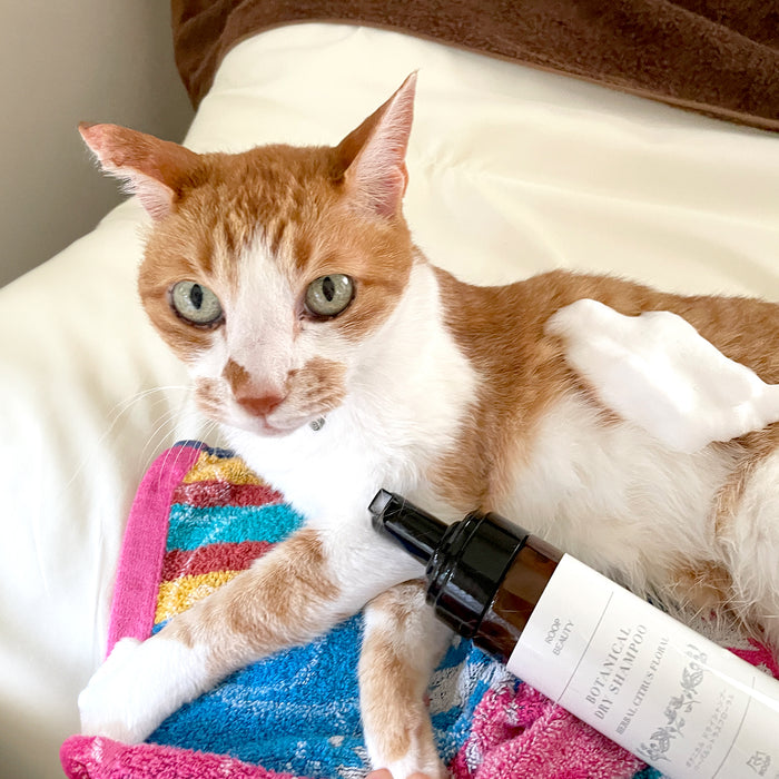 敏感肌のペットでも使える12種類のオーガニック成分(トリートメント成分、セラミド成分、静電気防止成分、抗菌消臭成分、虫よけ成分など)をたっぷり配合した、水で洗い流す必要がないドライシャンプーです。
